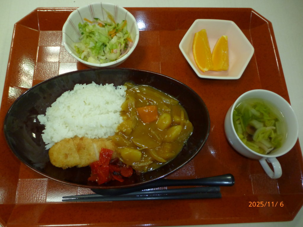 今日の昼食は“秋のカツカレー”。衣はサクサク、お肉は柔らかく野菜の素朴な甘みが広がります。