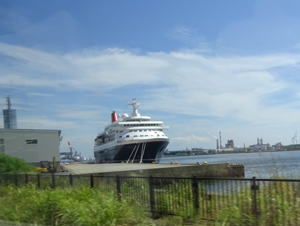 第2グループは、広小路を通りなかいち広場を横目で見ながら港に停泊中のクルーズ船を横切りアイスを食べながら移動