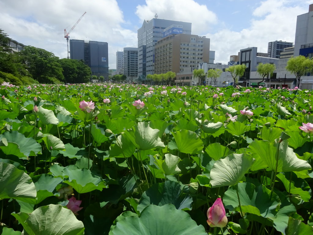 お堀のハスの花の前でお写真を撮りました。