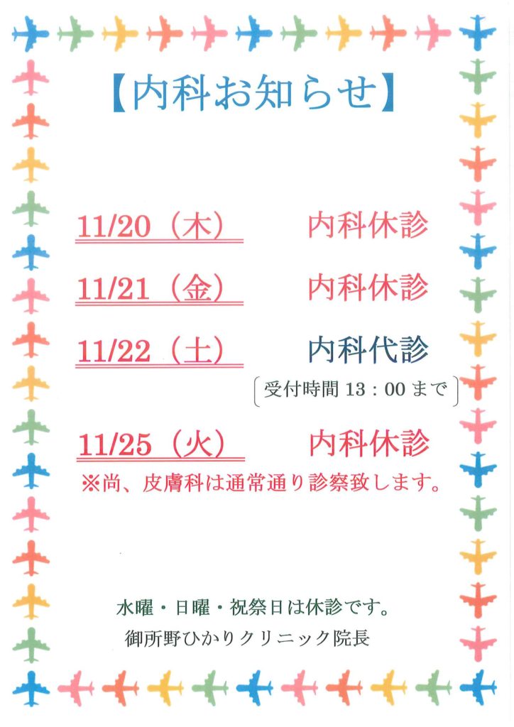 御所野ひかりクリニック 内科・11月臨時休診、代診のお知らせ 2025年9月26日 writer 内科、下記の日程で臨時休診、医師代診となりますので、 ご理解、ご協力お願い致します。 尚、皮膚科は通常通りの診察となります。