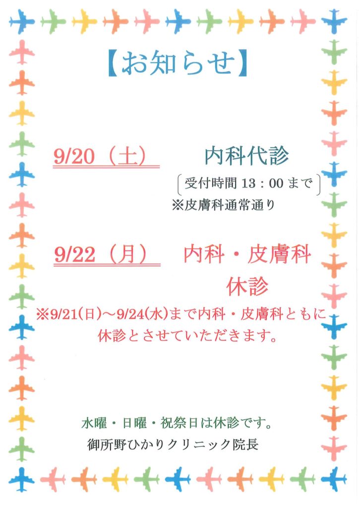 御所野ひかりクリニック 9/20(土)内科代診・9/22(月)臨時休診のお知らせ 2025年9月1日 writer 下記の日程で、医師代診及び臨時休診と なりますのでご理解、ご協力お願い致します。 9月20日(土) 内科、日赤医師代診 9月22日(月) 内科・皮膚科共に臨時休診